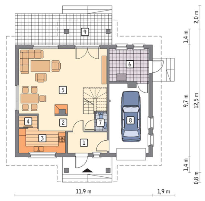 Еще на нижнем уровне находится блок вспомогательных помещений: гараж, прихожая и топочная, из которой можно сделать домашнюю мастерскую.