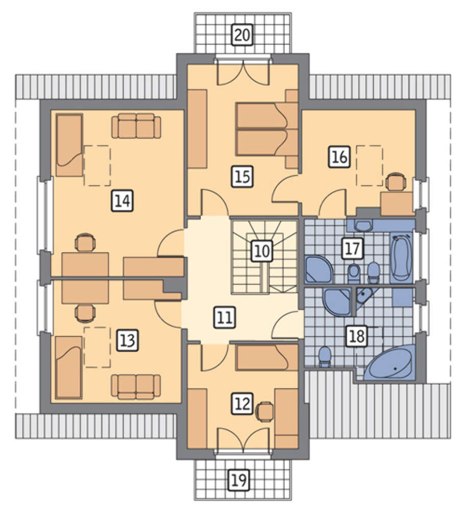 Коттедж с мансардой в 205 кв. м. не только решит жилищные проблемы большой семьи из 4-5 человек, но и обеспечит ее комфортное проживание. Экстерьер дома привлекает удачным сочетанием белоснежных стен и оранжевой крыши, создающим хорошее настроение и  ощущение вечного праздника. К месту здесь  фасадные панели в светло-бежевом и коричневом колере, они прекрасно вписываются в концепцию внешнего вида здания. Даже  серые водостоки и ограждения балконов не портят  картинку, а вносят в нее некую изюминку аристократизма и благородства.