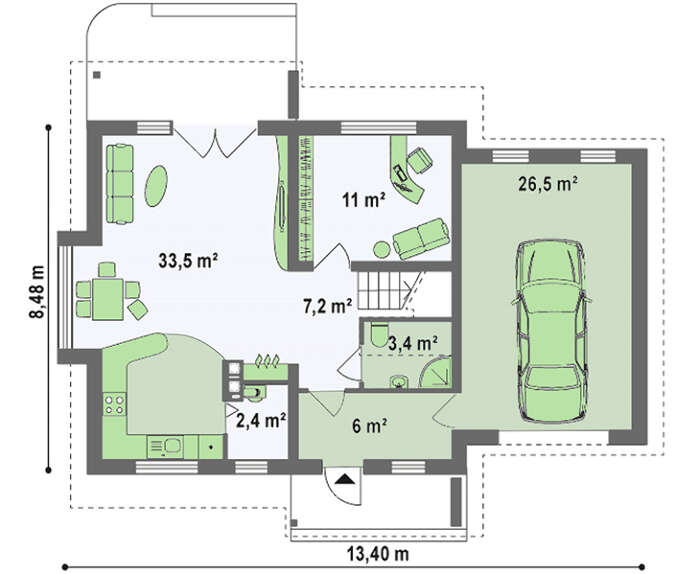 • 4M013G Проект аккуратного загородного одноэтажного коттеджа с мансардой и гаражом для автомобиля