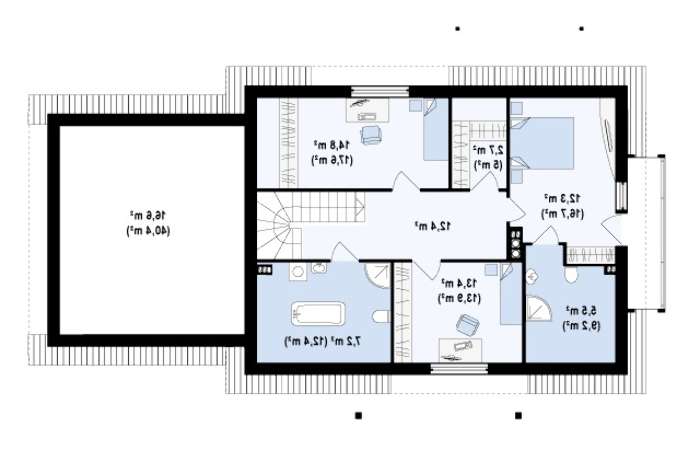 На втором этаже находятся три спальни, небольшая гардеробная и ванная с прачечной. А чердачное пространство над гаражом можно использовать как подсобное помещение. Например, как дополнительную кладовую.