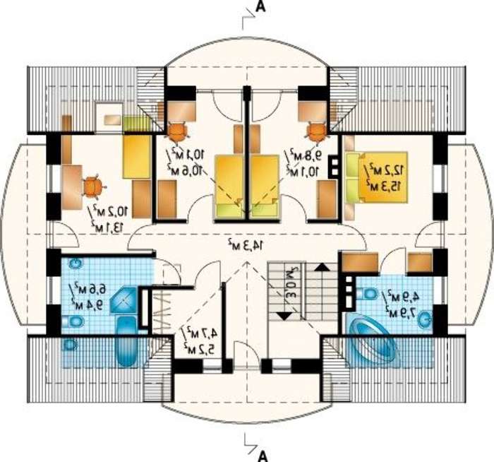 Расслабляться в таком строении планируется на двух этажах, для этого отведено пять отдельных помещений. Все комнаты второго уровня имеют выходы на балкон. Размещение конструкций по разным сторонам строения позволяет уединиться и не потревожено наслаждаться тишиной и покоем. Личные покои первого этажа немного отдалены от комнат коллективного пользования, такая планировка очень востребована среди представителей старшего поколения, предпочитающих для жизни нижние комнаты.