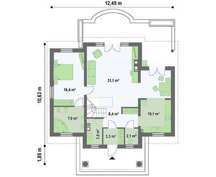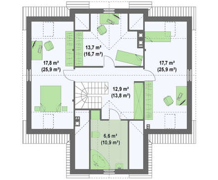 • 4M520 Проект дома 3-мя спальнями на мансарде и дополнительной спальней на первом этаже