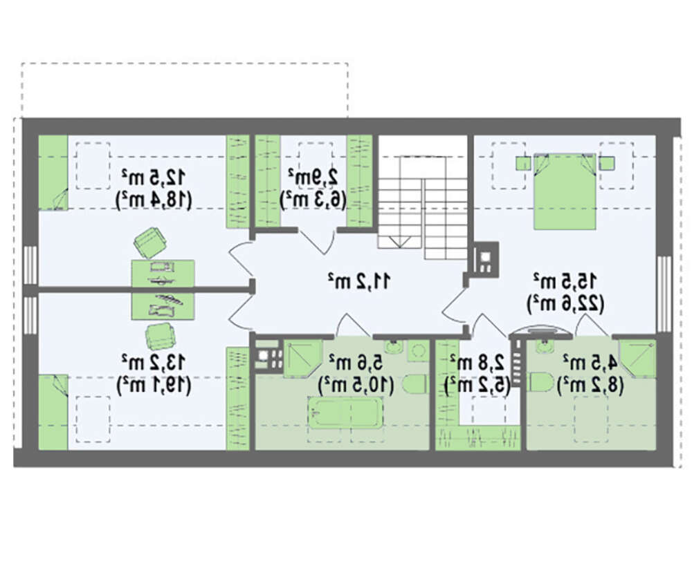 "Молодежная" ночная зона расположена в мансарде. Она состоит из трех спален, ванной комнаты, отдельного санузла с душевой кабинкой и больших гардеробных.