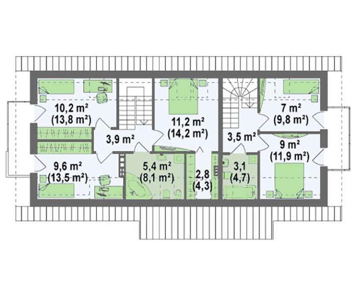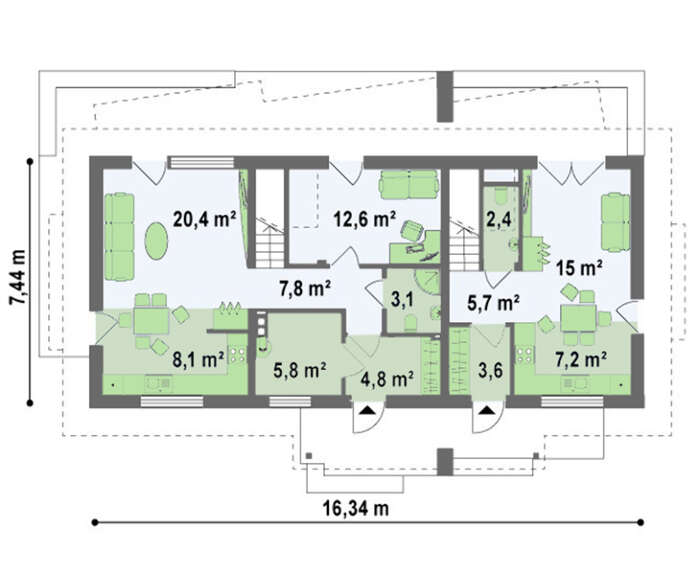 Проект дома на две семьи с отдельными входами будет интересен людям практичным. Как правило, такие дома выбирают семьи, состоящие из, минимум, трех поколений. Одновременно это и проживание вместе, и все преимущества жизни в собственном загородном доме.