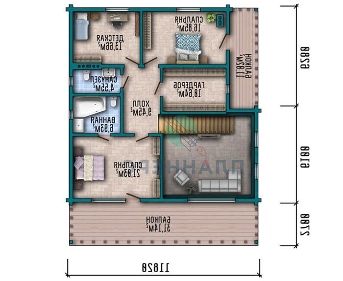 Верхний этаж занимают личные комнаты для отдыха членов семьи: спальня с балконом, детская, общее санпомещение, апартаменты владельца дома с собственным санузлом и просторной лоджией.