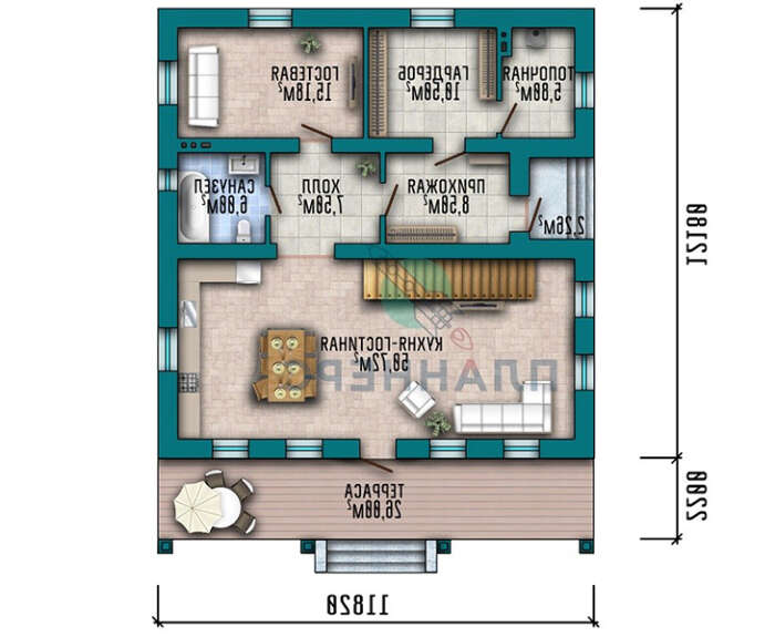 Внутренняя планировка - классическая. На первом этаже находятся помещения для дневного пользования, а на втором — спальни. Значительную часть площади нижнего уровня занимает гостиный зал 60 кв. м, полученный в результате слияния зоны отдыха, столовой и кухни. Отсутствие перегородок и второй свет делает помещение невероятно просторным. В торжественной праздничной обстановке можно отдыхать, принимать пищу, встречать гостей, веселиться и устраивать праздники. На остальной площади уровня разместилась гостевая спальня в 15 кв. м.