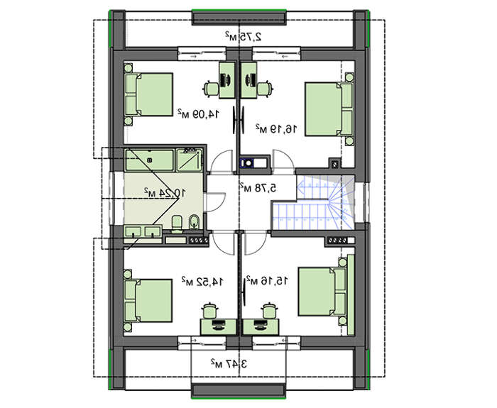 Запланировано пять личных комнат. Спальня первого этажа наиболее подходит старшему поколению семьи, для которых лестничные пролеты становятся трудными препятствиями. Четыре спальни второго уровня не слишком отличаются в габаритах и планировке, что ставит жильцов в одинаковые условия. Бонус — небольшие, но вместительные балкончики, выход на которые имеется во всех спальнях.