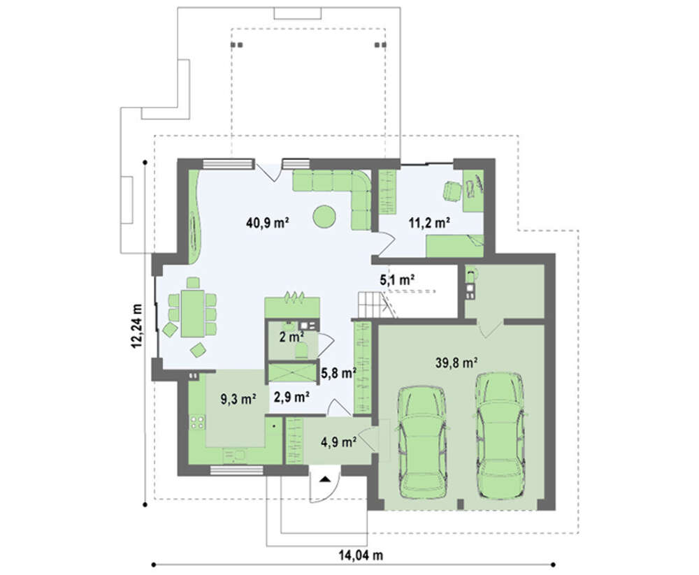 Проект коттеджа с фасадными окнами и гаражом для двух автомобилей