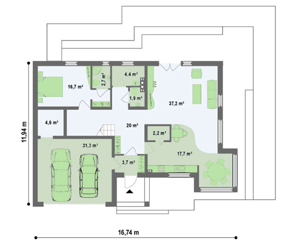 Проект дома с гаражом для двух автомобилей и угловым эркером