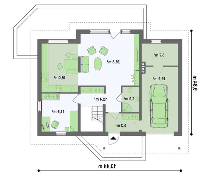 проект в зеркальном отображении позволит органично вписать дом в окружающий ландшафт.