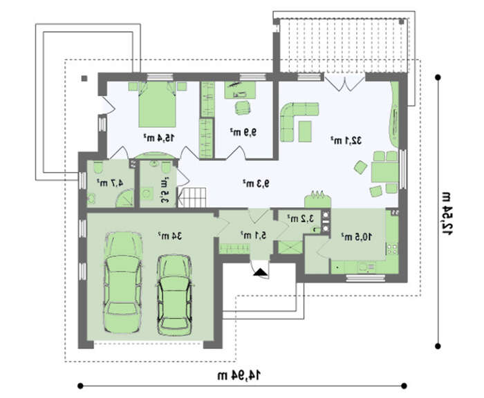 Для семьи, состоящей из нескольких поколений, проект дома с гаражом и дополнительной ночной зоной можно считать достойным вариантом загородного жилья. Главное достоинство этого дома в том, что при проектировании учтены интересы всех членов семьи. Тщательно спланированное внутреннее пространство позволяет рационально организовать повседневный быт.