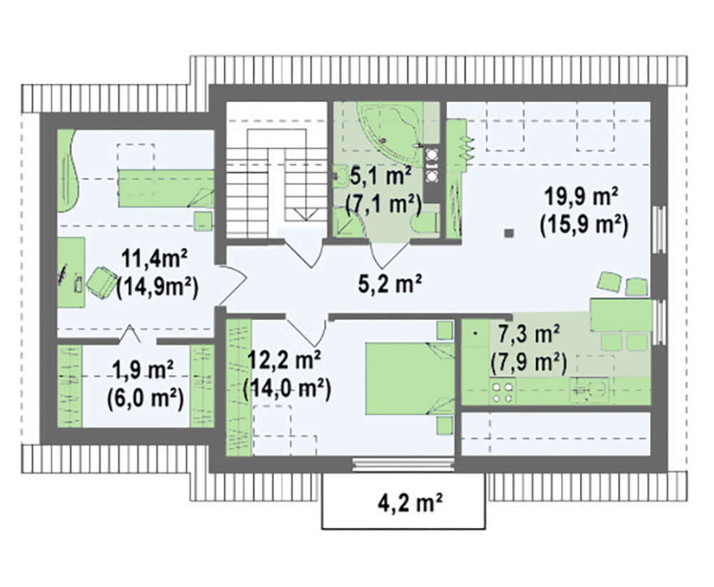 Мансарду занимает вторая семья. От нижней квартиры отличие в том, что здесь есть еще одна спальня с собственной гардеробной и вместо санузла оборудована полноценная ванная комната.