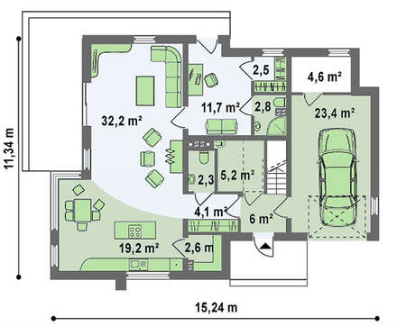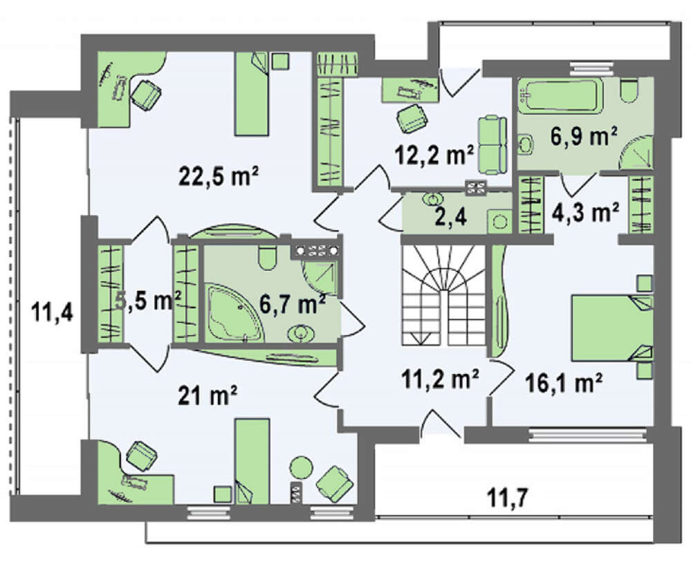Многие мечтают о большом доме, в котором бы хватило всем места, и по утрам не надо занимать очередь в ванную, потому что их несколько. Подобная роскошь, конечно, доступна далеко не каждому. Но даже если у человека деньги есть, то не всегда он может воплотить мечту в реальность. Не все большие дома одинаково хороши и удобны. Основное предназначение дома в его функциональности. Кому нужны десяток комнат, если ни одна из них не будет удобной и уютной. Как говориться, чем больше места, тем больше хаоса. Но это не о доме 4М652. В нем все гармонично и функционально. Гостиная, кухня, кабинет – на первом этаже, а все спальни – на втором. Есть в нем и гараж, ведь машина – это неотъемлемый атрибут современного человека. Особо выгодно на фоне современного фасада смотрятся балкончики и терраса.