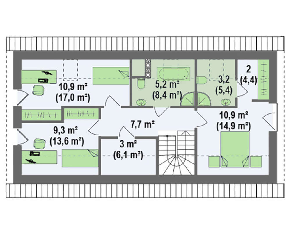 Компактный, с хорошо продуманной внутренней планировкой, проект дома с высокой мансардой, большими окнами в гостиной удобен для жизни и экономичен в строительстве и обслуживании.