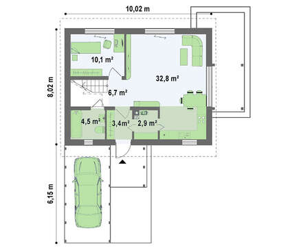 Дом 4М194, как и его французские «прародители», имеет жилые комнаты под крышей - мансарду. Снаружи это одноэтажный дом с двускатной крышей, а внутри получились полноценные два этажа. Такие дома существенно экономят место и строительные материалы, а значит деньги. Хозяин дома выигрывает как в материальном, так и эстетическом плане. Аккуратность дома подчеркнута ухоженным газоном и красивыми клумбами. Возле дома нет гаража, но есть подъезд и парковочное место для автомобиля. Оригинально смотрится навес для авто. Еще его можно использовать как основу для плетущихся садовых растений: кампсис, вьющаяся роза, клематис. Они не только украсят двор, но и создадут приятную тень.