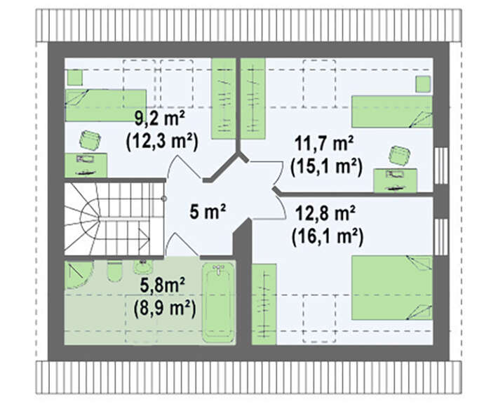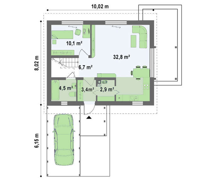 Дом 4М194, как и его французские «прародители», имеет жилые комнаты под крышей - мансарду. Снаружи это одноэтажный дом с двускатной крышей, а внутри получились полноценные два этажа. Такие дома существенно экономят место и строительные материалы, а значит деньги. Хозяин дома выигрывает как в материальном, так и эстетическом плане. Аккуратность дома подчеркнута ухоженным газоном и красивыми клумбами. Возле дома нет гаража, но есть подъезд и парковочное место для автомобиля. Оригинально смотрится навес для авто. Еще его можно использовать как основу для плетущихся садовых растений: кампсис, вьющаяся роза, клематис. Они не только украсят двор, но и создадут приятную тень.