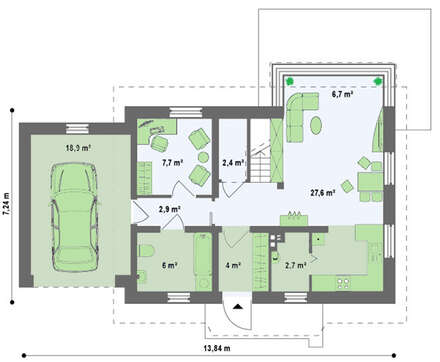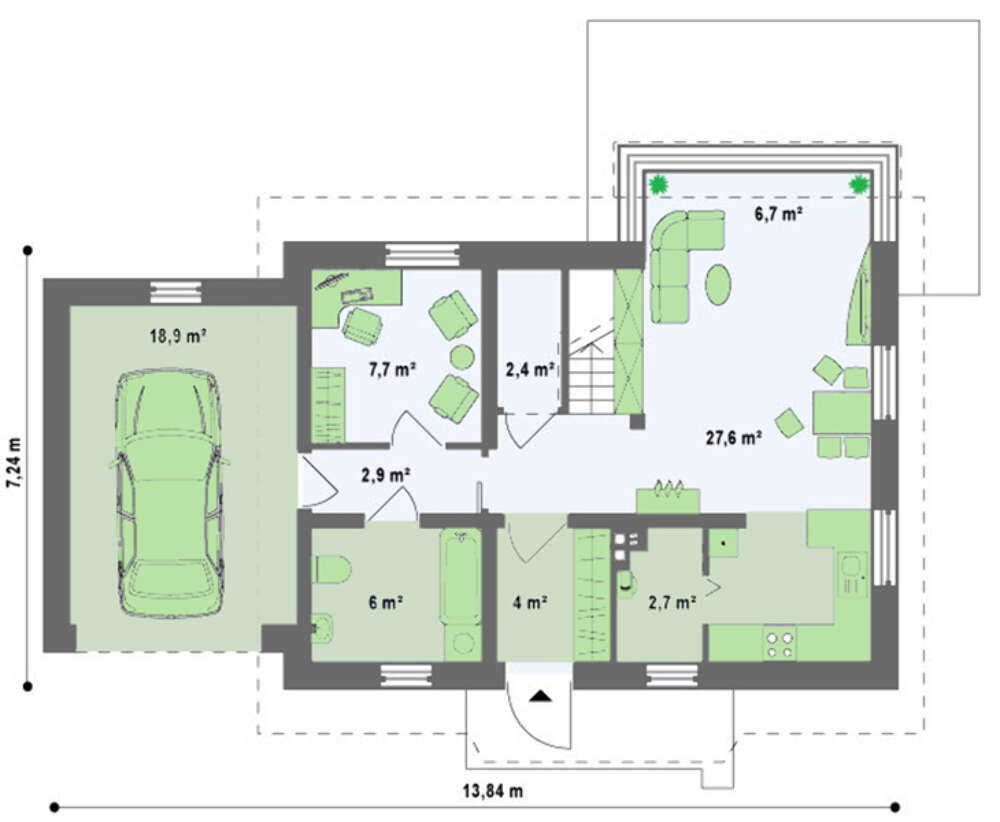 Проект дома с мансардой, гаражом и уютной красивой террасой