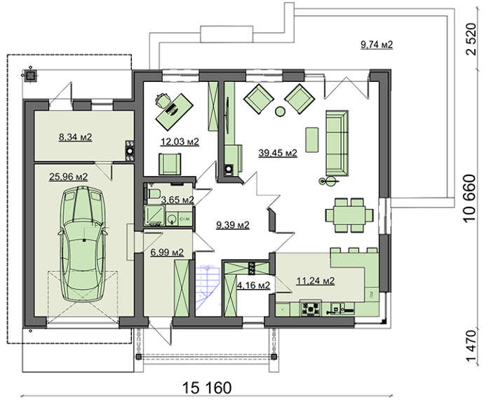 Проект содержит три раздела – АрхитектурныйКонструктивный и Инженерный: водоснабжение, отопление, вентиляция, канализация, электроснабжение (приобретается за дополнительную плату) + Пояснительная записка.