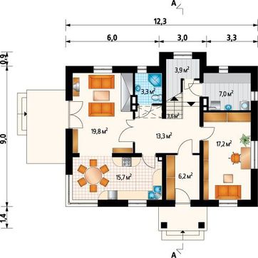 При оформлении экстерьера особое внимание уделено желтому цвету, такая расцветка помогает создать хорошее настроение, наполняет коттедж душевной добротой и дружелюбием. Внутреннее пространство максимально рационально разделено на помещения, без темных углов и множества коридорчиков.