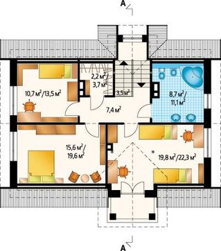 Комната первого этажа, на усмотрение хозяина, может быть меблирована как спальня для старшего поколения или людей с ограниченными возможностями. Три личных пространства второго уровня помогут разместиться всем членам семьи. Одна из них за счет уютного балкона создает романтичную атмосферу. Жильцы получают возможность много времени проводить на свежем воздухе.