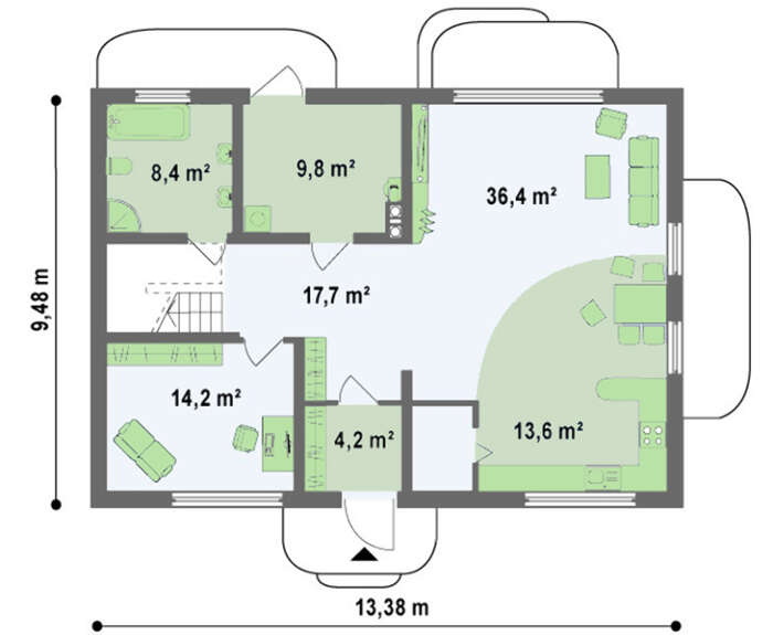 Оригинальный проект дома с просторной гостиной представляет собой изящное строение в европейском эко-стиле: сдержанная архитектура, отделка фасадов деревом, низкое энергопотребление и высокий коэффициент удержания тепла.