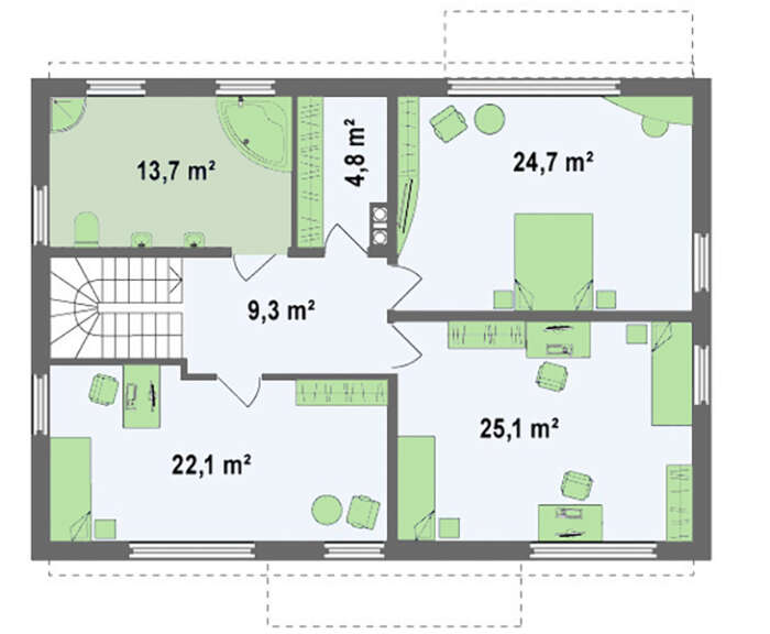В трех больших спальнях на втором этаже предусмотрены большие окна. Вместительная гардеробная впечатляют своими размерами. А в ванной, кроме стандартной сантехники, можно установить еще и душевую кубинку.