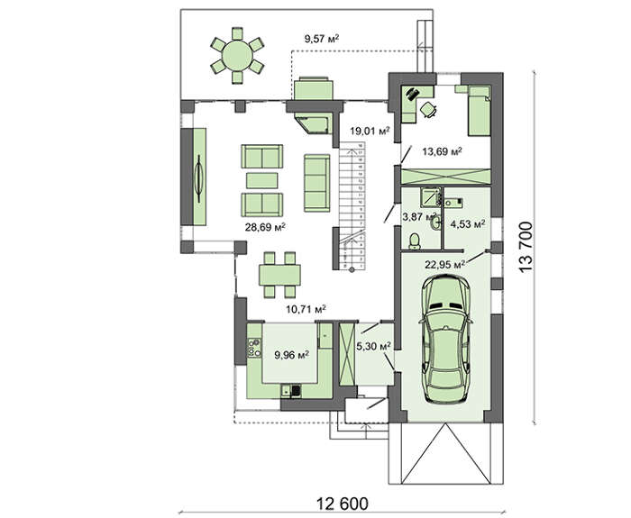 Просторный гараж 23 кв. м. позволит хранить автомобиль представительского класса. Котельную дополнительно можно использовать в качестве домашней мастерской, нужной в частном секторе.