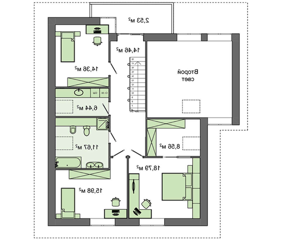 Второй этаж отведен под личную территорию членов семьи. Здесь расположены апартаменты хозяина дома с собственным гардеробом, две спальни, почти одинаковой площади, санитарное помещение с душевой и ванной, а также бытовая комната. Для желающих полюбоваться восходом и выпить чашечку бодрящего кофе на уровне имеется балкон.