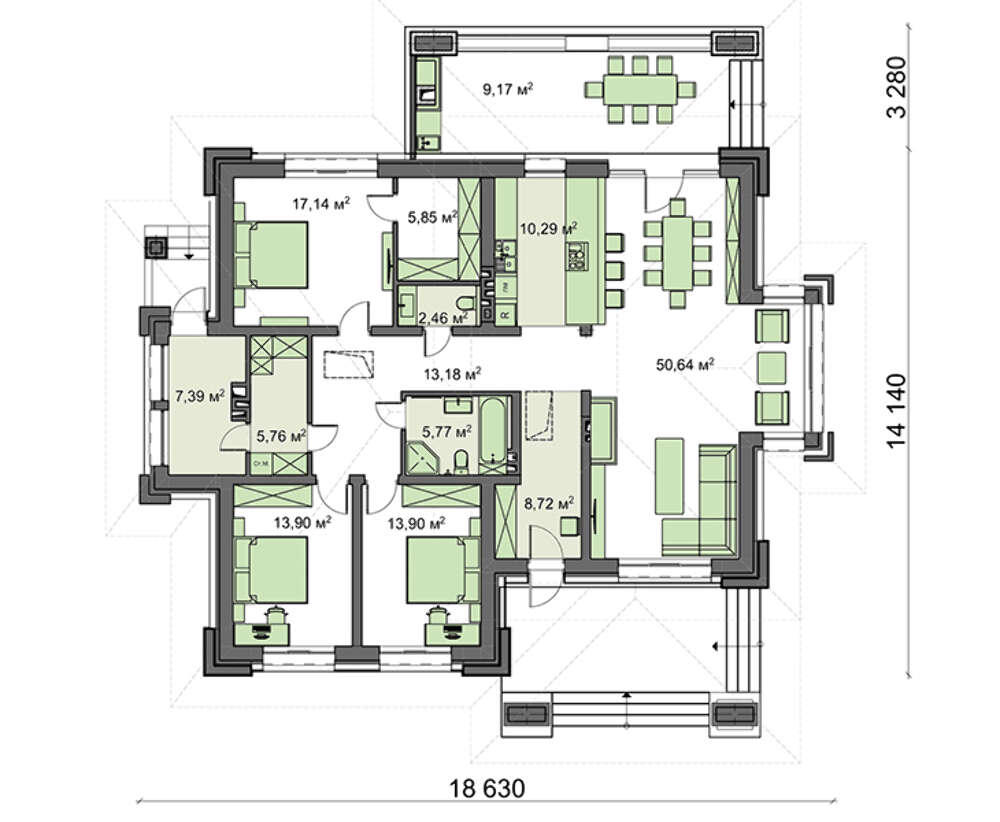 Столько же площади занимает личное пространство членов семьи. Оно включает две спальни для детей и апартаменты родителей с собственным гардеробом. Оставшиеся метры отданы под вспомогательные помещения. Это прихожая, два санузла и котельная, имеющая отдельный вход с улицы. Все комнаты соединяет между собой длинный Г-образный коридор.