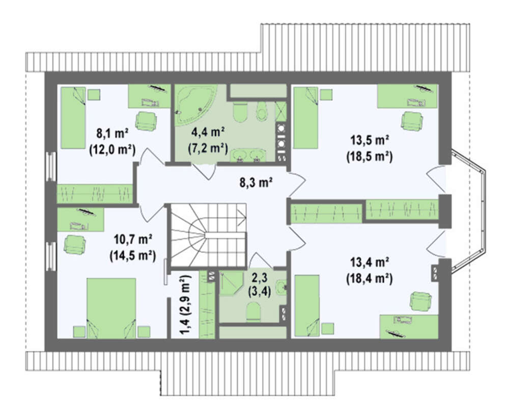 Если первый этаж – для бурной дневной жизни, то в мансарде расположена зона отдыха. Здесь находятся четыре спальни, ванная и санузел с душевой кубинкой. А в двух комнатах предусмотрены отдельные выходы общий балкон, расположенный над эркером.