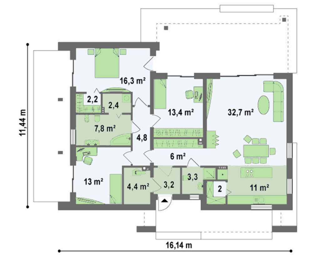 Удобная и функциональная планировка дает возможность поделить дом на дневную и ночную зоны. Хорошо освещенная гостиная с выходом на террасу вместе со столовой создает единое пространство. Его продолжает открытая кухня, оформленная в современном стиле "остров". К ней примыкает удобная и вместительная кладовая.