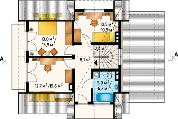 Для отдыха и личного времени отведено четыре комнаты. Помещение на нижнем этаже особо приглянется старшему поколению. Второй уровень будет по душе романтикам и мечтателям. Большой балкон позволит бесконечно долго заниматься любимым делом.