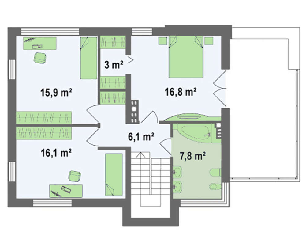 Второй этаж – это зона отдыха: 3 уютные спальни, гардеробная – мечта любой хозяйки, и просторная ванная комната – для полного релакса. Большое количество окон, которые есть со всех 4-х сторон дома, гарантируют наличие света и свежего воздуха, а так же солнечных лучей во время восхода и заката. Дополняет все это терраса, которая расположилась над гаражом.