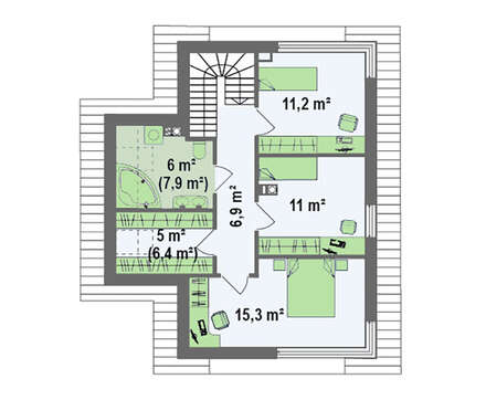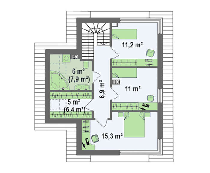 Под ночную зону полностью отведена мансарда. Три спальни, ванная комната, дополненная прачечной, и общая гардеробная создают защищенное приватное пространство, в котором все члены семьи будут чувствовать себя уютно и комфортно.