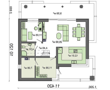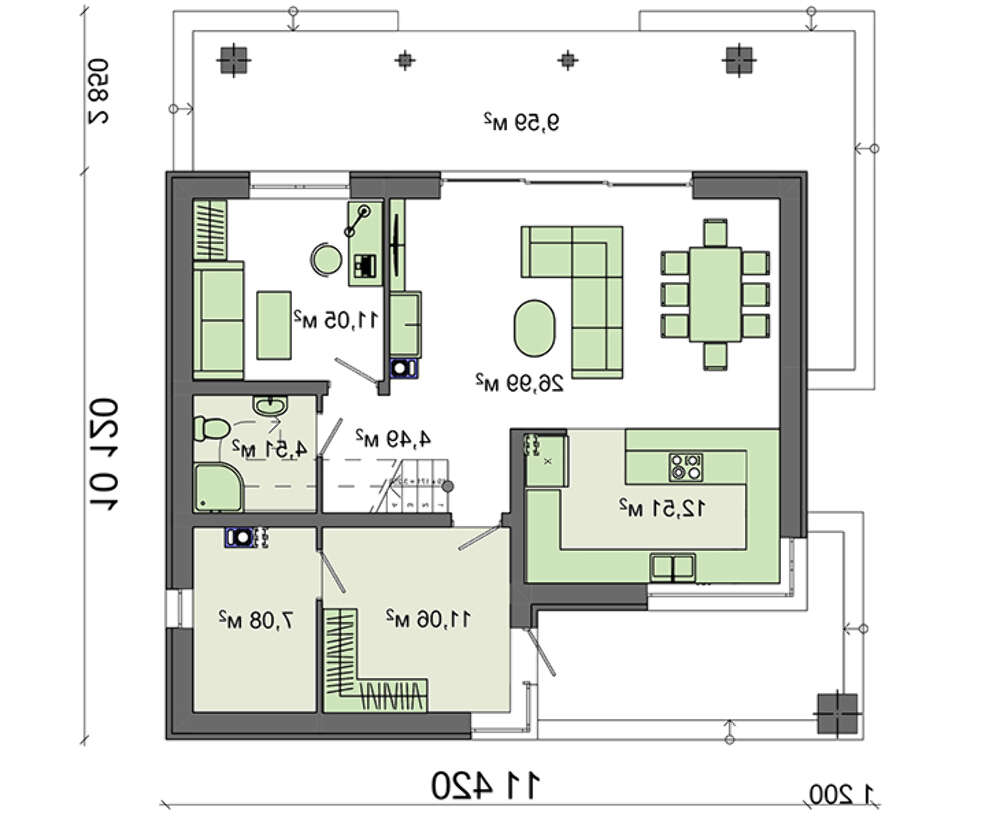 Внутри коттедж наполнен безграничной свободой. Здесь нет тесных и мало освещенных помещений. Все комнаты просторные и, благодаря большим окнам, залитые солнечным светом. Центральное место первого этажа отдано под гостиный зал, включающий зону отдыха, столовую и кухню. Отсутствие перегородок делает помещение невероятно большим. Здесь достаточно места для отдыха, проведения семейных торжеств, шумных вечеринок и встреч с друзьями. Летом площадь гостиной зоны увеличивается за счет примыкающей открытой веранды. Достаточно установить садовую мебель, мангал, и праздник переместится на свежий воздух.