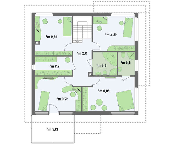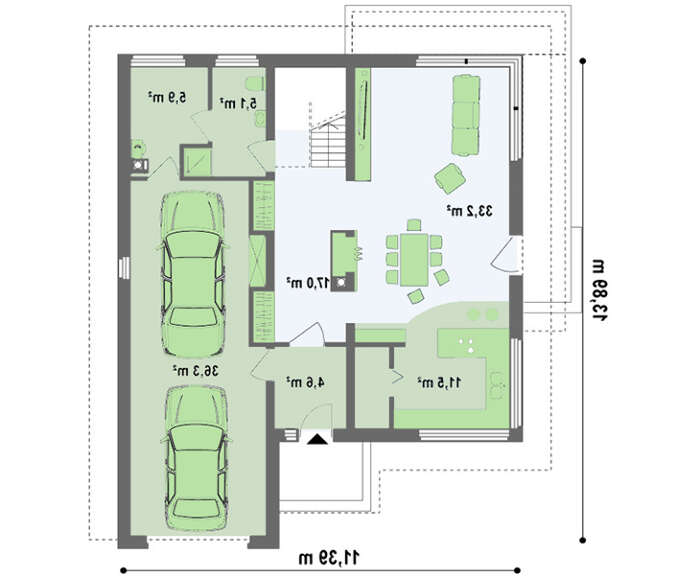 Проект двухэтажного дома с четырёхскатной крышей и удлиненным гаражом