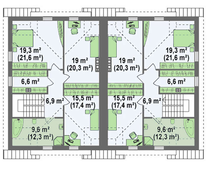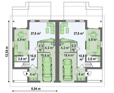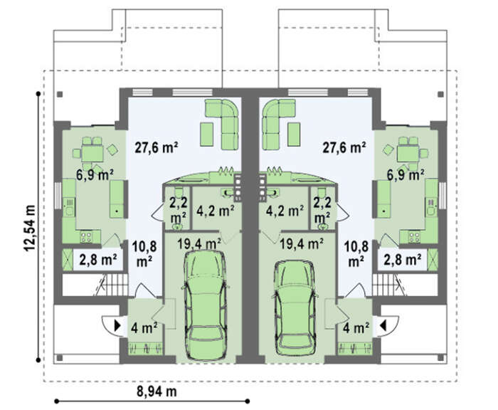 Очень часто близкие люди, такие как братья, сестры или же родители и их дети не хотят жить далеко друг от друга, но жить вместе им тоже не хочется. Это нормальное явление, ведь дети вырастают, создают свои семьи, и жить в одном доме им становится тесно. Дом 4м546 – хорошее решение для таких людей. В нем каждая семья будет иметь свой собственный дом, и при этом они будут оставаться под одной крышей. Такой дом станет отличным решением и в том случаи, если имеется только один земельный участок или средства не позволяют купить два. Главное, только чтобы его ширины было достаточно. Одноэтажный дом с мансардой поместил в себе две полноценные квартиры с гаражами. Каждая их них имеет свою кухню, гостиную, ванную комнату и достаточное количество спален.