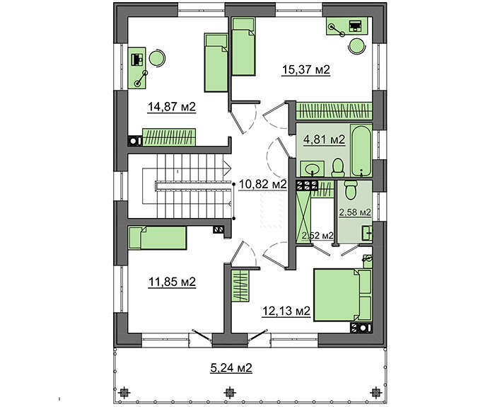 Второй этаж представлен спальными помещениями. Здесь четыре комнаты. В особом почете апартаменты хозяина. Чтобы добавить удобств, в их планировку добавлен санузел и гардероб. Роскошный балкон, доступ к которому открыт из двух спален, внесет разнообразие в отдых, добавит романтики и праздника в обычные будни.
