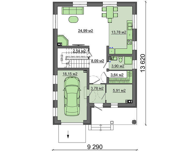 Первый этаж отведен под помещения дневного времяпрепровождения. Для хранения автомобиля предусмотрен компактный гараж. Просторная студия рассчитана на полноценный семейный отдых. За счет соединения со столовой и кухней, она приобрела огромные размеры. Между зонами разного назначения перегородки не предусмотрены, деление выполняется только за счет меблировки. Для того чтобы упростить труд хозяйки, позволить ей заниматься хозяйством и контролировать все происходящие в помещении события, центральное место рекомендуется отдать под столовую мебель. К вспомогательным комнатам относится котельная, холл, прихожая, гардероб и санузел.
