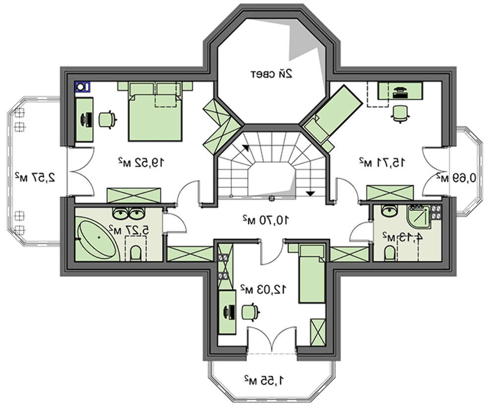 Второй этаж относится к территории отдыха. Здесь находятся личные апартаменты для всех жильцов семьи. Они представлены тремя просторными спальнями с балконами. Удобства создают расположенные на верхнем уровне два санузла.