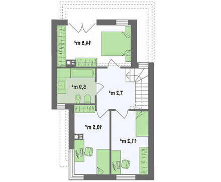 Личное пространство жильцов размещено на верхнем этаже, где находится три спальни и общий санузел.