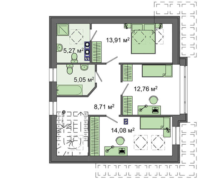 Проект содержит три раздела – Архитектурный, Конструктивный и Инженерный: водоснабжение, отопление, вентиляция, канализация, электроснабжение (приобретается за дополнительную плату) + Пояснительная записка.