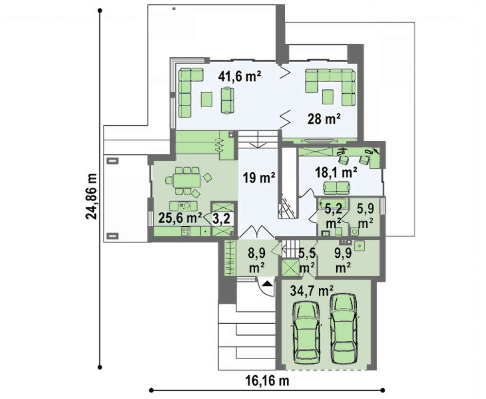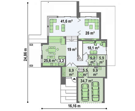 При проектировании внутреннего пространства приняты все меры по обеспечению комфорта и созданию условий для повышения благоустройства проживающих. Сохранность автомобилей гарантирует просторный гараж, пространство которого рассчитано на хранение двух единиц автотранспорта. Небольшая, но достаточная для выполнения сервисных работ, мастерская поможет решить все вопросы обслуживания машин.