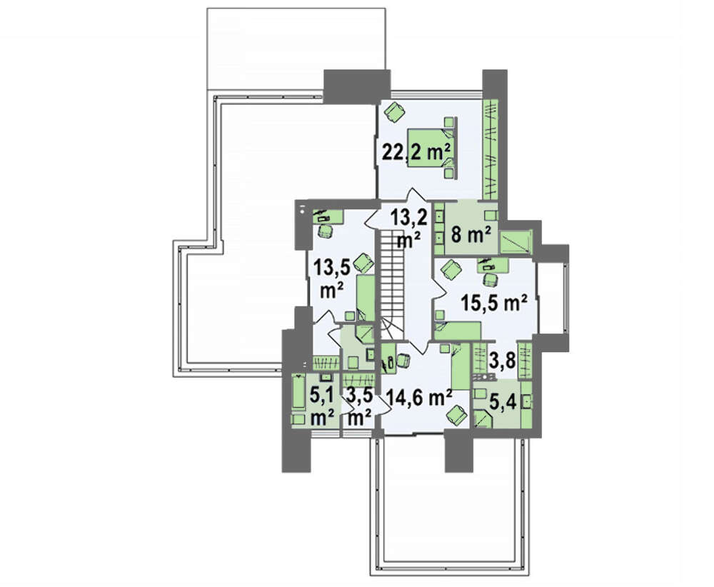 Особыми благоустройствами наделены личные покои. Кроме жилой площади, в их размеры включены гардеробные и санитарные помещения. Выход на просторную террасу дает жильцам неоспоримые преимущества. Габаритов достаточно для полноценного отдыха: принятия солнечных ванн, отдыха на свежем воздухе, небольшого пикника и даже шашлычной церемонии.