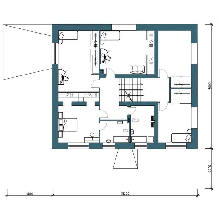 На втором этаже находятся личные комнаты членов семьи. Благодаря различной планировке можно подобрать помещение себе по вкусу. Хозяйские апартаменты выигрывают за счет собственного санузла.