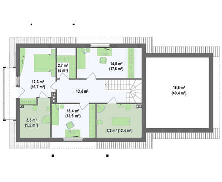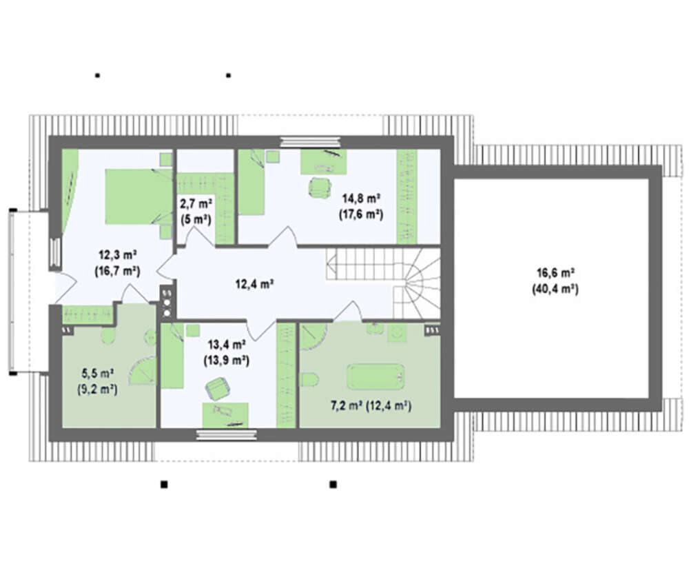 И ночная зона, расположенная на втором этаже, полностью соответствует современным представлениям о комфорте. Но есть еще одно преимущество, заложенное в проект. Можно легко, без больших затрат обустроить просторные террасы на верхнем этаже. Одну – над гаражом, вторую – над гостиной, тем самым превратив открытую террасу в закрытую.