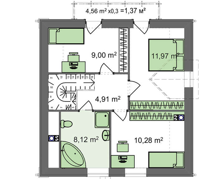 Проект содержит три раздела – Архитектурный, Конструктивный и Инженерный: водоснабжение, отопление, вентиляция, канализация, электроснабжение (приобретается за дополнительную плату) + Пояснительная записка.