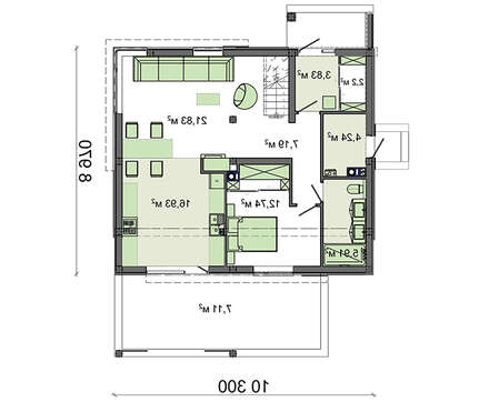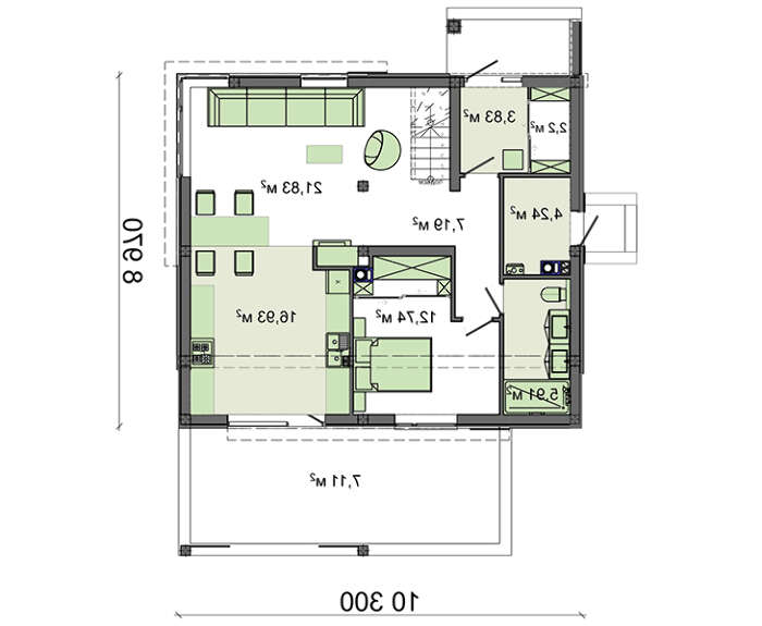 Проектировщики разумно распределили площадь и смогли найти место под помещения разного функционального назначения. Большая часть пространства отведена под студию, в ее состав вошла столовая или кухня. Г-образная форма позволила подальше раздвинуть места разного назначения. Для гардеробной выделена небольшая комната при входе, ее площадь рассчитана на хранение запасов зимней одежды. Особенность первого этажа в отдельном помещении необычной формы с нишей. Здесь уютно будет отдыхаться старшему поколению, и проводить деловые переговоры хозяину дома.