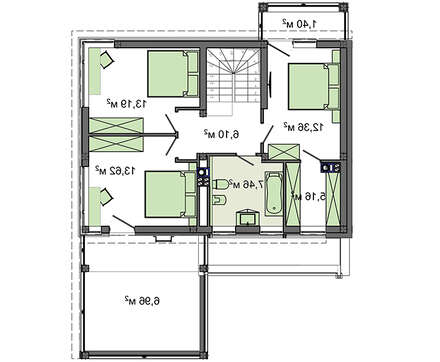 Второй этаж представляет собою зону уютных личных апартаментов. Все три комнаты имеют разные размеры и формы. Для хозяина больше подойдет спальня с личным гардеробом и балконом. Молодое поколение высоко оценит комнату с просторной террасой, закрытой от атмосферных осадков.