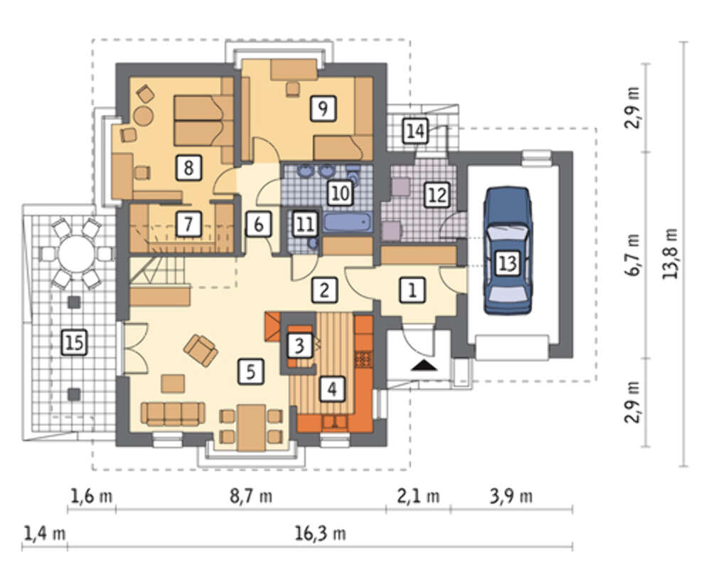 Архитектурный паспорт содержит самые общие сведения о проекте частного дома. Здесь вы не найдете подробных описаний. Вся более детальная информация дана в архитектурном и конструктивном разделах проекта. В паспорте же указаны только основные размеры и высоты. Также в нем отражены технико-экономические показатели будущего строения.